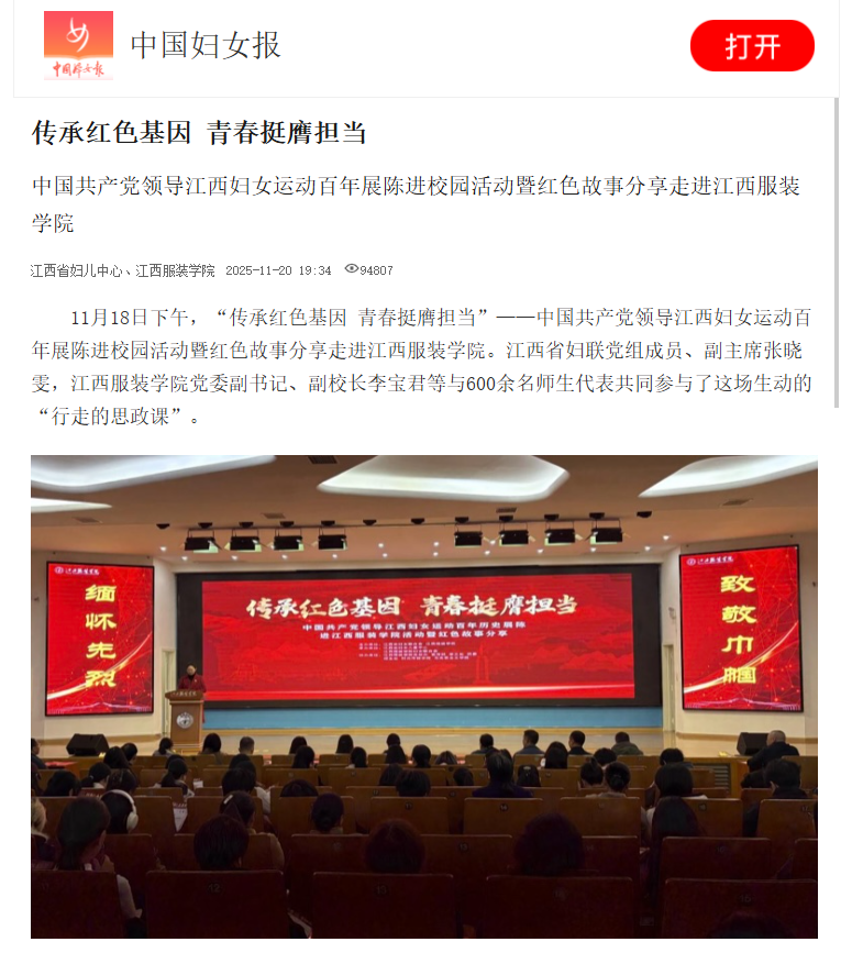 中国妇女报:传承红色基因 青春挺膺担当 中国共产党领导江西妇女运动百年展陈进校园活动暨红色故事分享走进江西服装学院