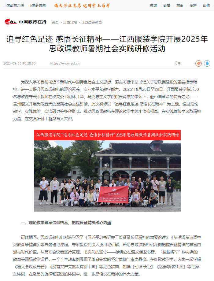 中国教育在线:追寻红色足迹 感悟长征精神——江西服装学院开展2025年思政课教师暑期社会实践研修活动