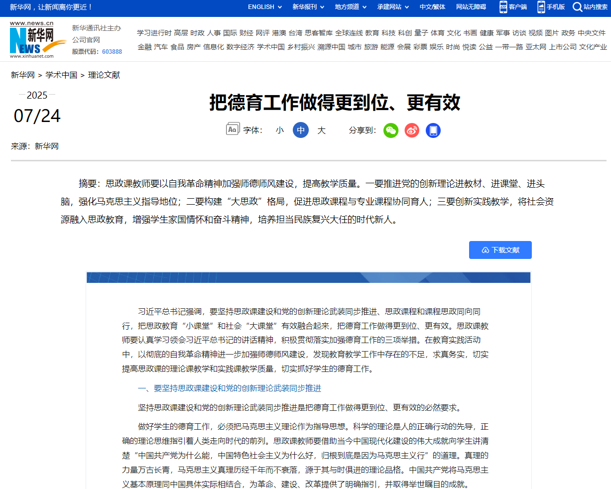 7月24日,新华网理论频道发表我校马克思主义学院吴雄生副教授的理论文章《把德育工作做得更到位、更有效》。
