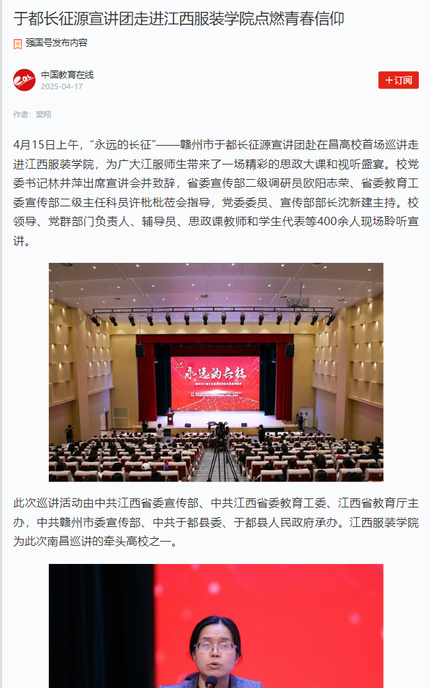 学习强国:于都长征源宣讲团走进江西服装学院点燃青春信仰