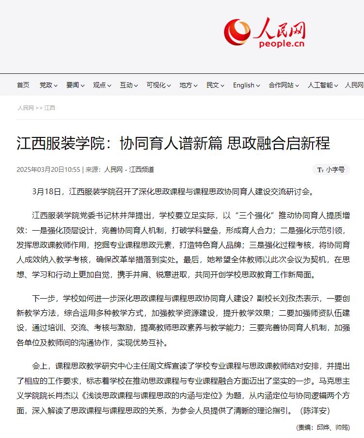 人民网:江西服装学院:协同育人谱新篇 思政融合启新程