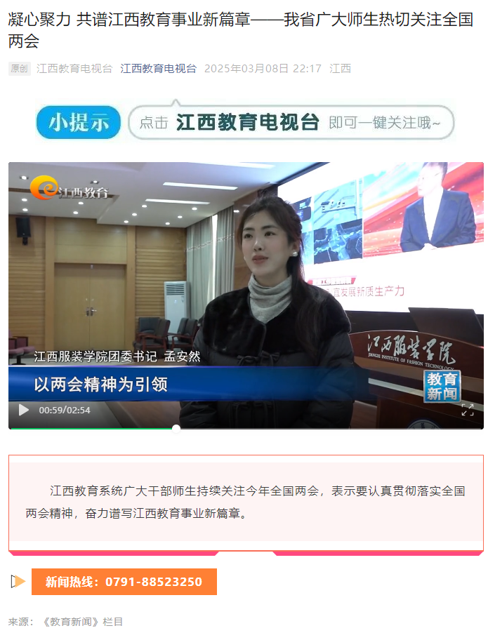 江西教育电视台:报道江西服装学院师生热切关注全国两会