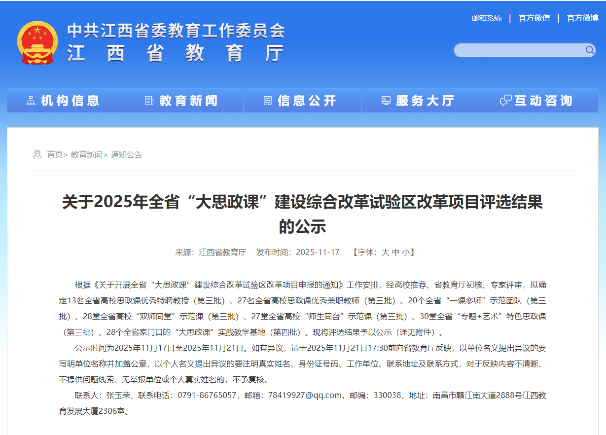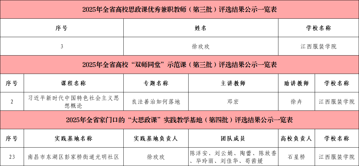 (马克思主义学院 讯)近日,江西省教育厅公布了2025年全省“大思政课”建设综合改革试验区改革项目评选结果,经高校推荐、省教育厅初核、专家评审等多个环节,我校凭借扎实的育人根基、创新的实践模式与鲜明的专业特色,在师资建设、基地培育、课程打造三大领域同步发力,揽获多项省级荣誉。 在师资队伍建设上,我校思政课兼职教师、南昌市光明社区党委书记徐玫玫获“2025年全省高校思政课优秀兼职教师”。 在实践教学基地建设中,我校与南昌市光明社区共建的“大思政课”实践基地成功入选“2025年全省家门口的‘大思政课’实践教学基地”。 在思政课程建设方面,由我校马克思主义学院邓宏老师主讲、江西求正沃德(南昌县)律师事务所徐卉律师助讲的《习近平新时代中国特色社会主义思想概论》课程“良法善治如何落地”专题课入选“双师同堂”示范课。 荣誉背后,是学校深耕思政教育的坚守与创新。自2019年设立马克思主义学院以来,马克思主义学院便确立“立德树人、培根铸魂、正本清源、守正创新”的建院宗旨,以制度建设为根基,构建起权责明晰、保障有力的思政建设体系。校领导班子更是躬身入局,校院领导班子深入思政课堂听课调研,通过现场办公、集体备课指导等方式,为思政课建设精准把脉定向,推动形成“党委统筹、马院主抓、多部门协同”的育人格局。 “此次获奖是对我校思政工作的肯定,更是新的起点。”马克思主义学院负责人表示,学校将以此次获奖为契机,持续深化思政课教学体系,进一步推动思政教育与服装文化、红色文化、公益文化深度融合。未来,江西服装学院将继续坚持为党育人、为国育才初心,打造更多有温度、有特色、有力量的思政“金课”,让思政之花在校园绽放,为培养德智体美劳全面发展的高素质服装人才筑牢思想根基。