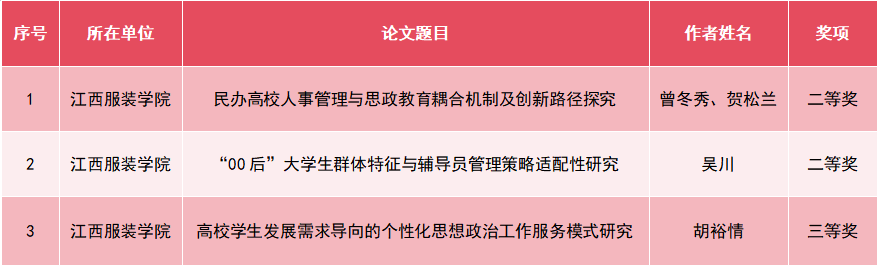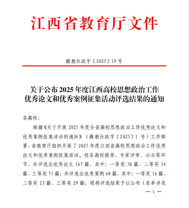 (马克思主义学院 讯)近日,江西省教育厅公布了2025年度全省高校思想政治工作优秀论文和优秀案例征集活动评选结果。 经严格遴选,我校多篇论文脱颖而出。曾冬秀、贺松兰老师撰写的《民办高校人事管理与思政教育耦合机制及创新路径探究》,吴川老师撰写的《“00后”大学生群体特征与辅导员管理策略适配性研究》荣获2025年江西省高校思政工作优秀论文二等奖;胡裕情老师撰写的《高校学生发展需求导向的个性化思想政治工作服务模式研究》荣获2025年江西省高校思政工作优秀三等奖。 一直以来,江西服装学院高度重视思想政治工作,始终将思政工作理论研究与实践创新摆在重要位置,通过搭建学术交流平台、设立研究专项等方式,鼓励教师深耕思政领域研究,不断提升思政工作科学化水平。此次多篇论文在省级评比中获奖,既是对学校思政工作研究成果的充分肯定,也是对全体思政工作者的极大激励。 下一步,学校将以此次获奖为契机,深入总结研究经验,推动获奖成果转化应用于育人实践,持续深化思政工作改革创新,不断提升思政工作科学化、规范化水平,为培养担当民族复兴大任的时代新人筑牢思想根基。
