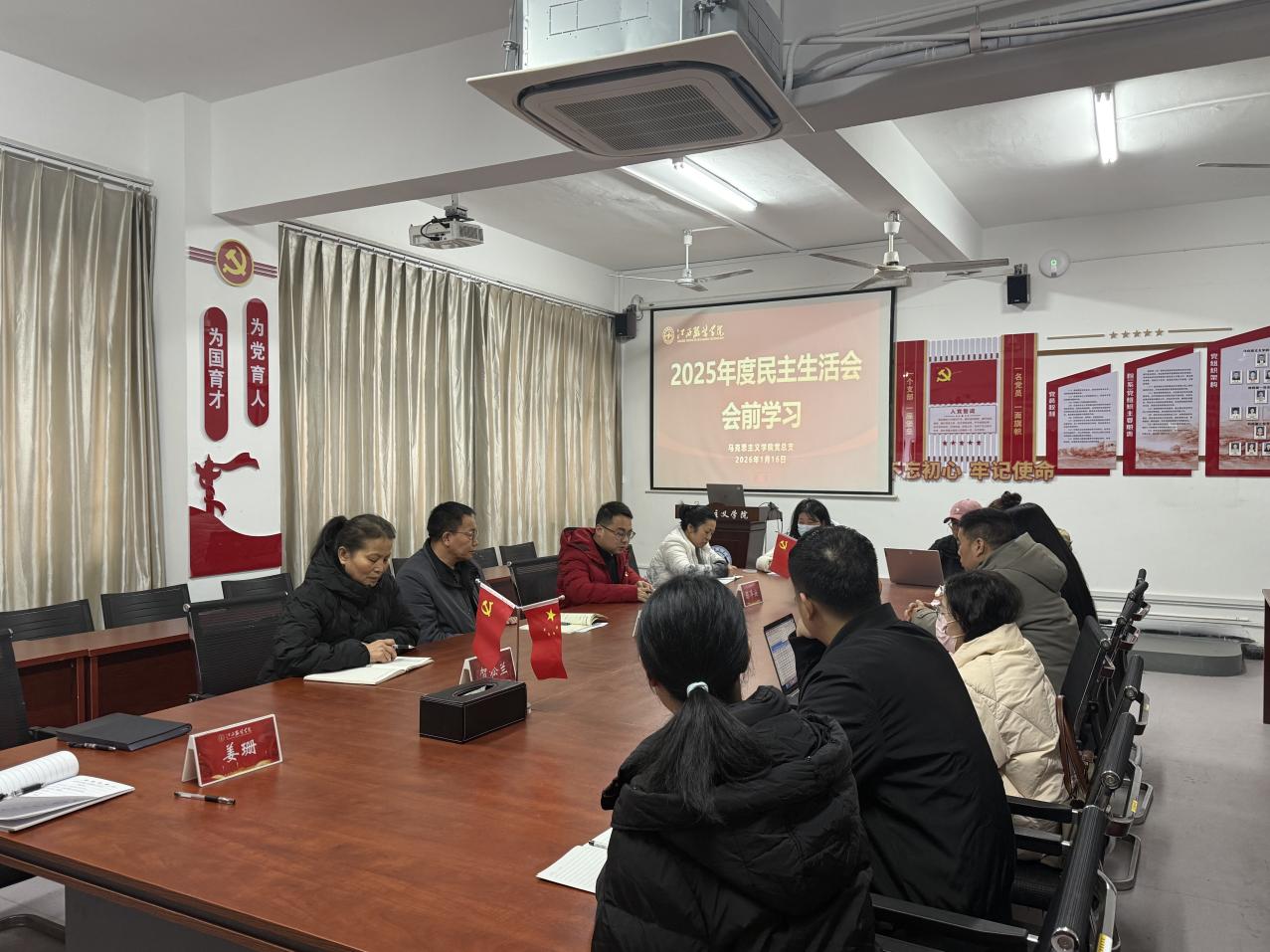 (马克思主义学院 讯)2026年1月16日下午,马克思主义学院党总支在主教学楼240会议室召开2025年度民主生活会会前集体学习。学院党总支成员,两个教师党支部书记及委员,各教研室负责同志参加会议,会议由学院党总支副书记陈洋安主持。 本次学习会以深入学习领会习近平总书记关于党的建设的重要思想、关于党的自我革命的重要思想以及关于加强党的纪律建设、作风建设的重要论述以及《中国共产党章程》等内容,深刻认识作风建设的重要性紧迫性,以打攻坚战、持久战的决心和恒心,锲而不舍落实中央八项规定精神,推进作风建设常态化长效化。 会上集中学习了习近平总书记在中央政治局民主生活会、二十届中央纪委五次全会上的重要讲话精神,为开好2025年度民主生活会打牢思想基础。学院党总支领导班子成员结合工作实际进行了交流发言,一致表示将把学习成果转化为履职实效,推动全面从严治党与学院办学治院、教学科研工作深度融合。 陈洋安同志对开好2025年度民主生活会提出具体要求。一是要深化思想认识,提高政治站位。二是要扎实做好会前准备,筑牢会议基础。三是要聚焦会议主题,严肃开展批评与自我批评。四是要狠抓问题整改,健全长效机制。五是要明确责任分工,强化组织保障。陈洋安强调,本次会前学习内容充实、重点突出,全体参会人员要以此次学习为契机,进一步强化理论武装、提升政治素养、锤炼优良作风。要切实把学习成果转化为推动工作的实际行动,严格落实民主生活会各项要求,扎实做好会前准备、会中检视批评、会后整改等工作,以高度的政治责任感和务实的工作作风,确保2025年度民主生活会顺利召开,为学院高质量发展提供坚强政治保障。