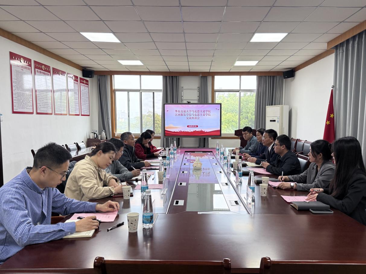 (马克思主义学院 讯)4月15日下午,江西服装学院马克思主义学院院长肖杰、党总支副书记陈洋安、副院长贺松兰等一行6人,赴华东交通大学马克思主义学院开展专题交流学习活动。华东交通大学马克思主义学院党委书记陈和金、副院长刘晓伟、李曦及教师代表等热情接待,双方围绕思政教育核心工作开展座谈交流。 在座谈交流会上,华东交通大学马院党委书记陈和金致欢迎辞,并介绍了华东交通大学的办学概况,重点突出学校铁路特色办学优势,解读了学校“火车头”党建品牌建设成效。同时介绍了华东交通大学马院在党的建设、品牌打造、学科建设、师资队伍、教育教学及科研成果等方面的实践成效。 肖杰院长对华东交通大学马院的热情接待表示感谢,介绍了江西服装学院办学概况以及学校马克思主义学院的发展情况。座谈中,双方围绕党建与业务深入融合、思政课教师队伍培养、思政课教学改革、大中小学思政课一体化建设等方面内容展开深入交流。华东交通大学马院详细分享了党建与教学科研融合的具体案例、思政课教师培训培养机制、开展思政课实践教学经验做法等。现场研讨氛围热烈,碰撞出诸多思想火花。 肖杰院长表示,此次交流座谈内容充实、干货满满,为两校马克思主义学院搭建了宝贵的学习交流平台,对华东交通大学马院毫无保留的经验分享表示衷心感谢,并表示希望今后建立常态化交流机制,多来学习借鉴、共促提升。座谈结束后,肖杰一行参观了华东交通大学马院党员活动室、研究中心、文化长廊等场所,实地感受其阵地建设和文化氛围,并合影留念。 此次交流增进了两校马院之间的了解与友谊,搭建了良好的互学互鉴平台,下一步将以此次交流为契机,深化合作、取长补短,聚焦立德树人根本任务,不断提升马克思主义理论学科建设水平和思政教育实效,共同推动思政教育高质量发展。