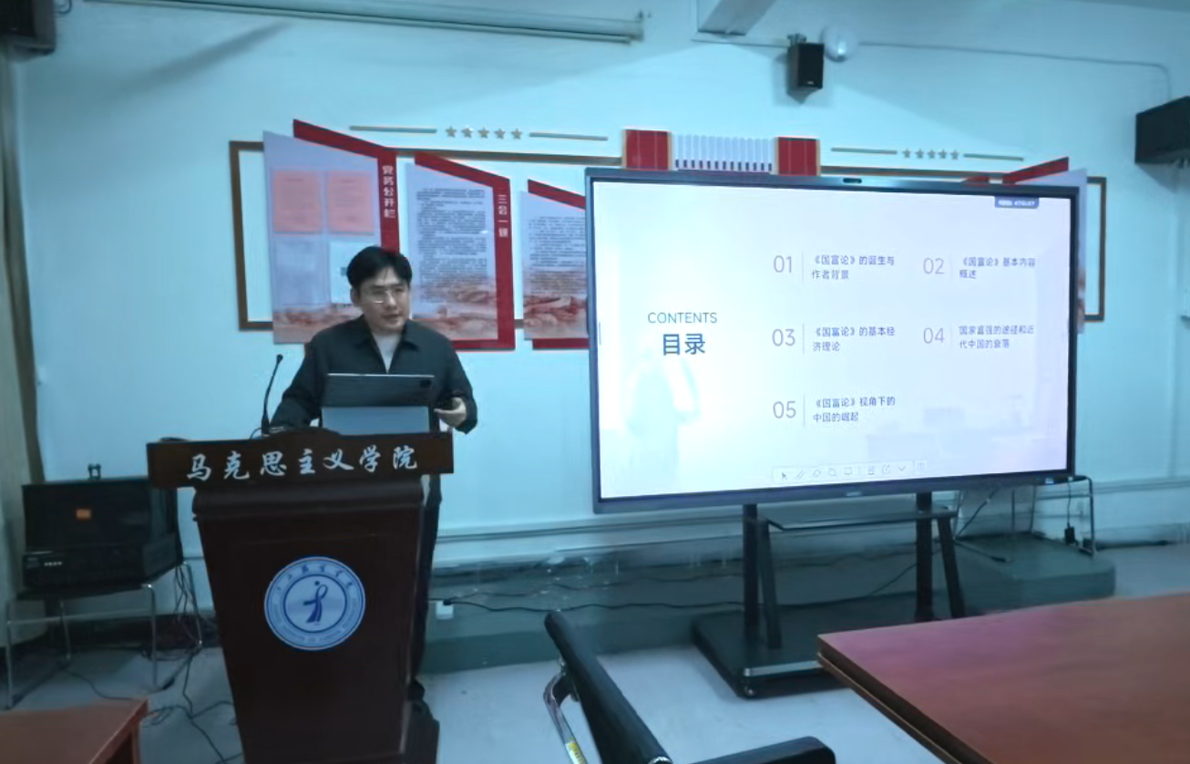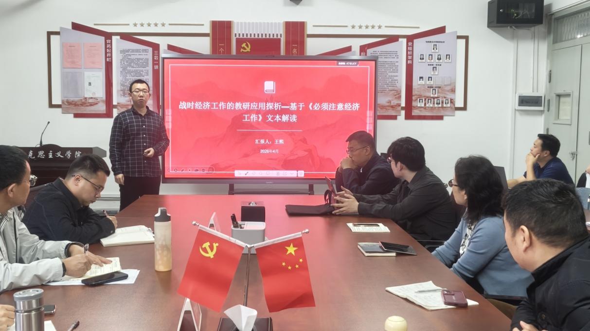 (马克思主义学院 讯)岁月恒久远,经典永流传。为深入贯彻习近平总书记关于推动全民阅读、建设书香社会的重要指示精神,全面落实《全民阅读促进条例》,持续推进“书香马院”建设,在第31个世界读书日与我国首个“全民阅读活动周”来临之际,4月21日下午,马克思主义学院在主教学楼240会议室举办“经典回响”读书交流分享活动(第二期)。学院全体教职工参加活动,活动由学院副院长贺松兰主持。 本次活动由马文亮、王熙两位青年教师围绕经典著作展开读书交流分享,与会教师畅所欲言、共研理论,在思想碰撞中凝聚育人共识、夯实理论根基。 在阅读分享环节,马文亮老师以“市场、制度与国运——《国富论》视角下的中国复兴路”为题,系统梳理《国富论》诞生背景、核心理论与时代价值,从劳动分工、“看不见的手”、自由贸易、制度革新等关键命题切入,结合近代中国衰落与当代中国崛起的历史脉络,深入阐释斯密经济思想对理解中国发展道路、市场机制与国家治理现代化的启示,贯通经典理论与中国实践,为思政课教学提供跨学科视野与历史参照。 王熙老师以“战时经济工作的教研应用探析——基于《必须注意经济工作》文本解读”为题,聚焦毛泽东经典著作,解读中央苏区反“围剿”时期严峻的军事封锁与经济困境,精准解读战时经济建设的战略定位、中心任务与实践路径,深刻阐释“经济建设服务革命战争”“以人民为中心”“实事求是”等核心思想,并结合《中国近现代史纲要》教学,提炼文本解读、案例教学、历史启示等教研方法,实现经典理论向思政课堂的有效转化。 在交流互动环节,王志军、魏园园、贺松兰等老师踊跃发言、深入研讨。大家一致认为,两场分享贯通中西经典、衔接历史与现实,既展现了经典著作的恒久魅力,又彰显了思政教师研读经典、服务教学的专业自觉。老师们就如何将西方经济经典与马克思主义政治经济学融会贯通、如何把苏区战时经济经验融入新时代思政课、如何提升经典研读的教研转化能力等问题深入交流,进一步拓宽了理论视野、提升了学习成效。 会议最后,学院院长肖杰作总结讲话。他指出,经典是理论的源头、思想的宝库、育人的根基。举办“经典回响”读书分享活动,是学院落实书香校园建设、强化教师理论武装、提升思政育人质量的重要抓手。他强调,读书交流分享活动要持续常态化开展,希望全体教师要坚持读原著、学原文、悟原理,从马克思主义经典、党的创新理论中汲取智慧,夯实育人根基;要推动经典研读与教学科研深度融合,把理论养分转化为教学实效与科研成果;要持续打造学院读书品牌活动,创新形式、丰富载体,让“书香马院”蔚然成风,以理论清醒坚定信仰,以思想自觉引领行动自觉,助力学院高质量发展。 此次读书交流活动,让经典著作在新时代焕发新光彩。学院将以读书分享为纽带,持续深化经典阅读、强化理论武装,引导全体教师在书香浸润中提升素养、在思想交流中凝聚力量,不断提升思政育人实效。会上,学院还明确了第三期“经典回响”读书分享活动人选,为后续活动开展奠定坚实基础。